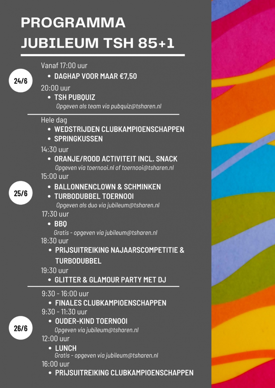 De clubkampioenschappen worden dit jaar van 20 t/m 26 juni gehouden. Omdat TSH vorig jaar 85 jaar bestond, maar we dat door corona niet hebben kunnen vieren, zijn de clubkampioenschappen dit jaar extra feestelijk. In het finaleweekend vieren we namelijk ook TSH 85+1 jaar!